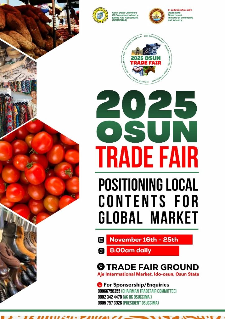 We’re excited to welcome you to the 2025 Osun Trade Fair, where the theme “Positioning Local Contents for the Global Market” takes center stage! This premier event brings together industry leaders, innovators, and entrepreneurs from around the world to showcase their local products, services, and talents, with a focus on global market penetration.